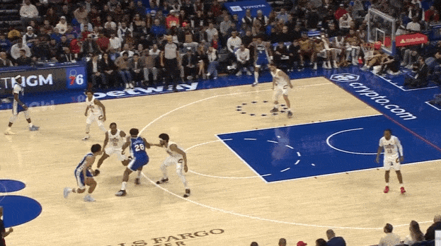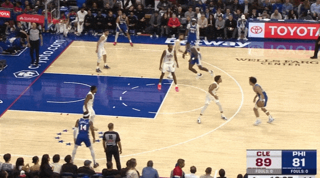 麦凯恩持球策动挡拆牵制双人防守,为队友创造出优势局面。上线米切尔兼顾一防二,魔仙突破行进间撩起手臂合球躲过强侧莫布里刷卡后,起跳回传给弱侧45°的乌布雷。