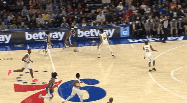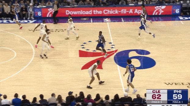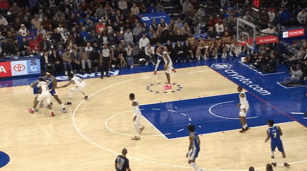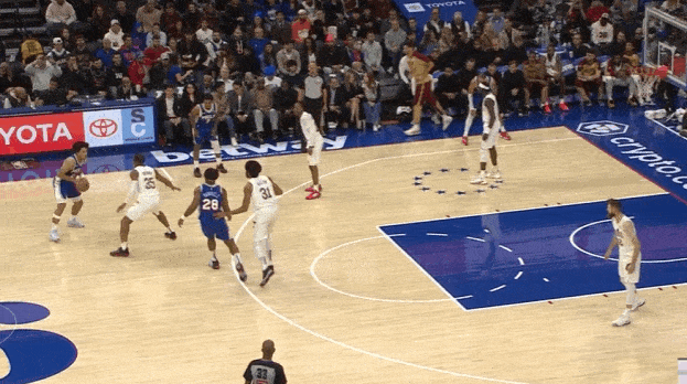 哈达威变向调度防守人重心后,迅速衔接胯下变向启动向中路的突破。突破行进至罚球线下一步使用一二步急停,随即拔起出手后仰中投,空心入网。