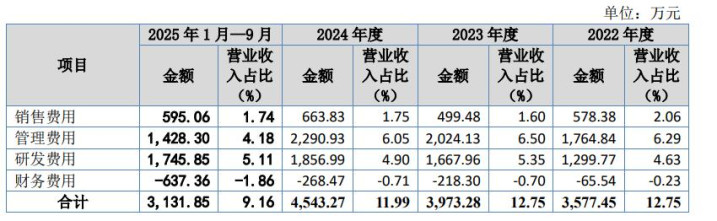 公司期间费用主要由销售费用、管理费用、研发费用和财务费用构成。报告期内,公司的期间费用分别为3,577.45万元、3,973.28万元、4,543.27万元和3,131.85万元,占同期营业收入的比重分别为12.75%、12.75%、11.99%和9.16%。