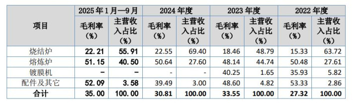2024年度,公司的烧结炉产品收入占比较高,熔炼炉产品的收入占比下降,导致公司的毛利率有所下降。2025年1-9月熔炼炉产品的收入占比上升,公司的销售毛利率相应提升。