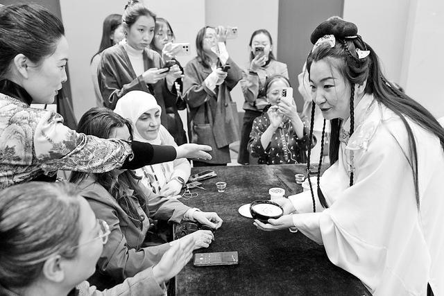 在“三八”国际妇女节来临之际,来自比利时、土耳其、希腊、智利、摩洛哥等24个国家的驻华大使夫人5日在北京参加大使夫人茶美学品鉴活动,以茶为媒,共话文化交流互鉴。图为宋式点茶表演吸引嘉宾 。 (中新社)